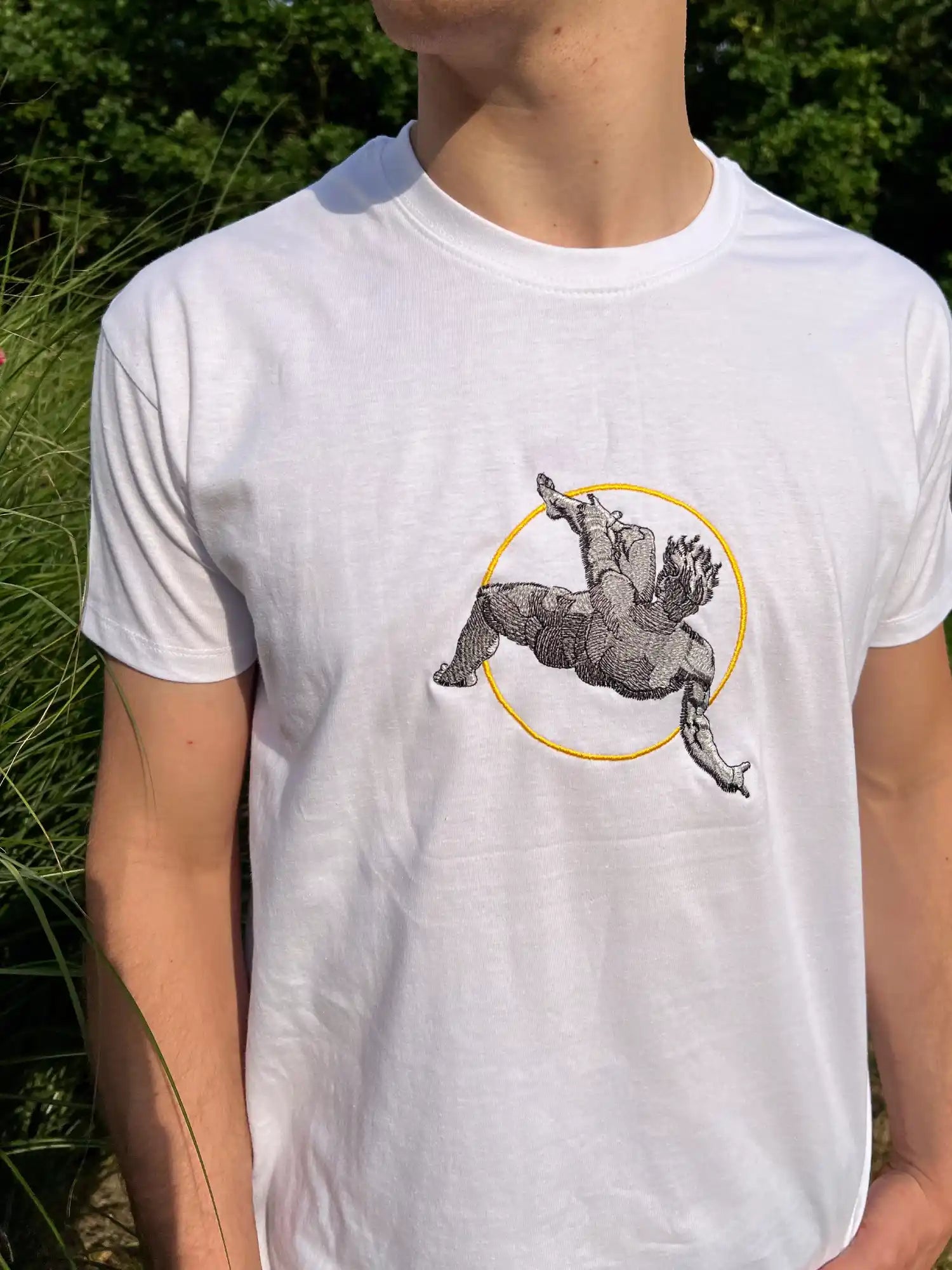 🌀 Dynamiczna sylwetka Ikara w momencie upadku – uchwycona w ruchu, otoczona złotym okręgiem niczym echo słońca. Nawiązanie do mitu i uniwersalnych emocji.
